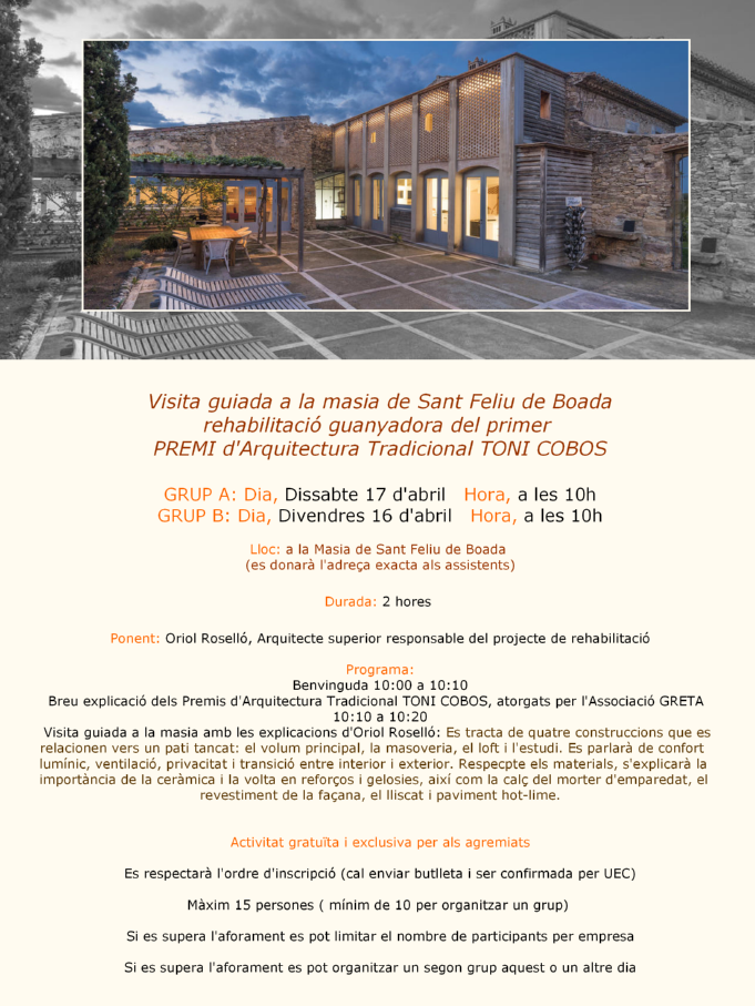 El proper divendres 16 d’abril estava prevista la visita guiada amb un grup de 16 persones, a la Masia de St Feliu de Boadas. Per causes de la metereologia s'ha traslladat l'acta al proper divendres 30 d'abril, s'està avisant a tots els confirmats.